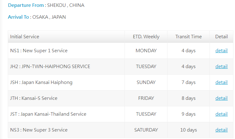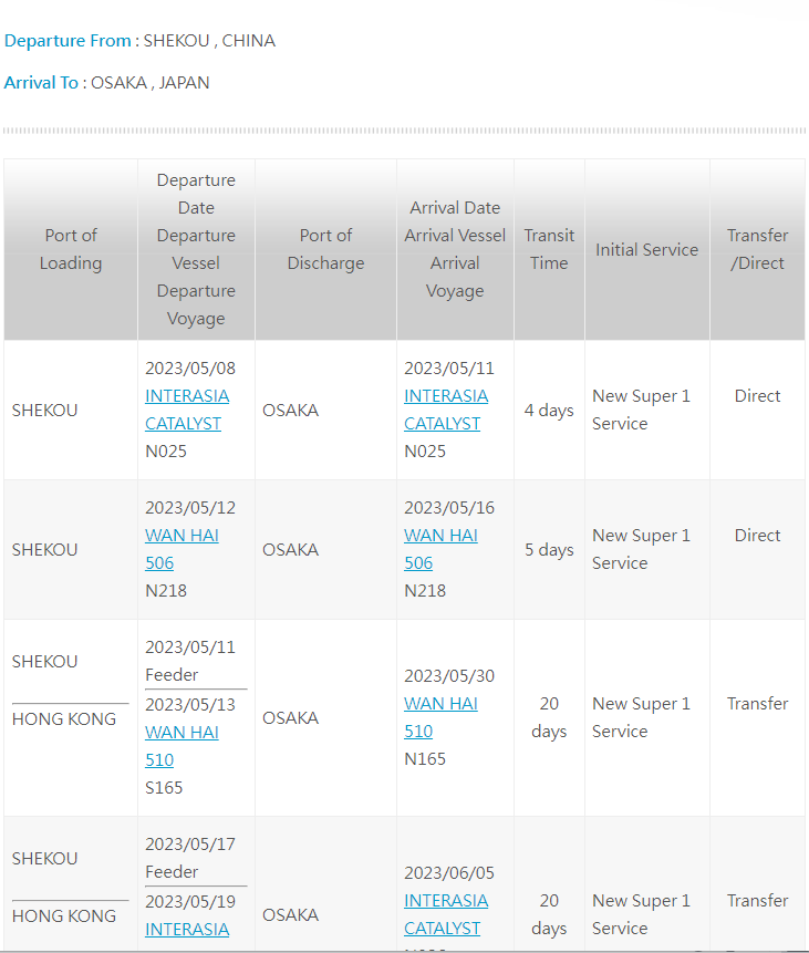 以2023年4月25日之后船期為例,詳細見下圖列表,如圖所示,萬海到大阪港的船期以及航程都一一列明。